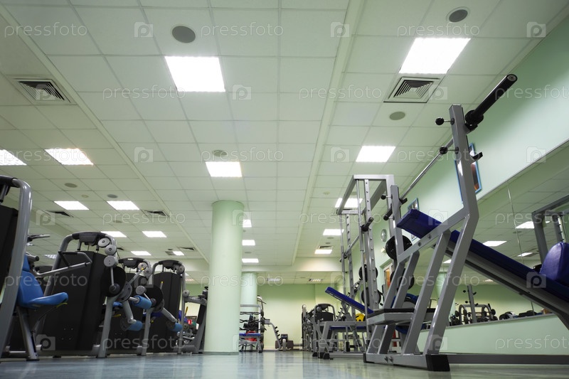 Чистое, современное пространство тренажерного зала с изящным фитнес-оборудованием под ярким светом