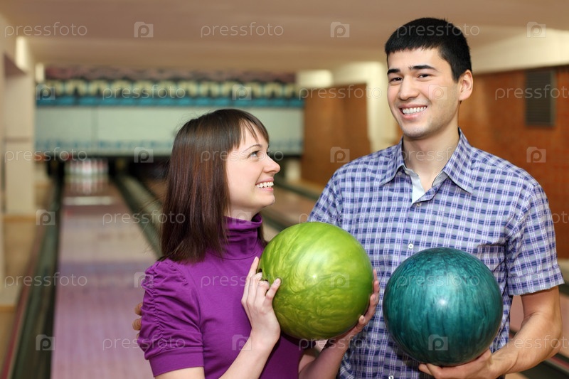 Молодая пара улыбается на боулинге