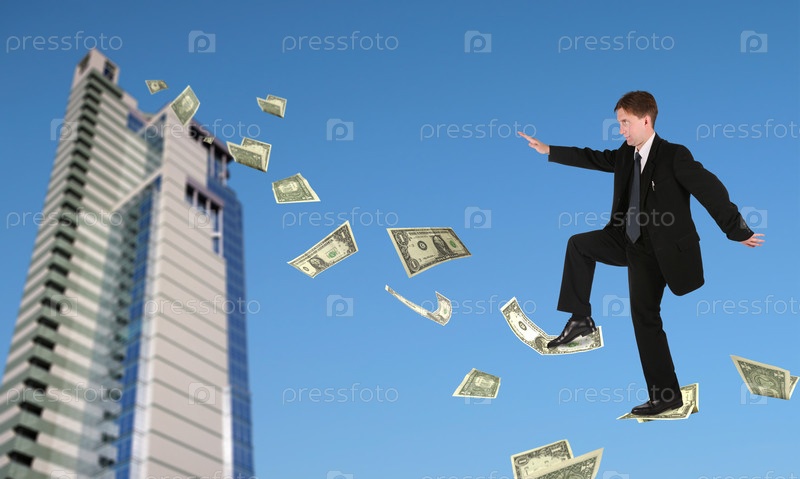 Бизнесмен, поднимающийся на долларах возле офисного здания и Sky