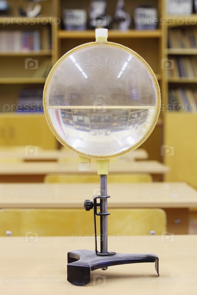 Старые водяные линзы для образовательных экспериментов по физике; пустая школа