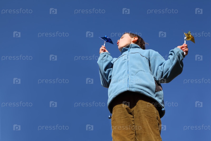 Маленький мальчик в синей куртке и коричневых брюках дует на шестеренки в своем