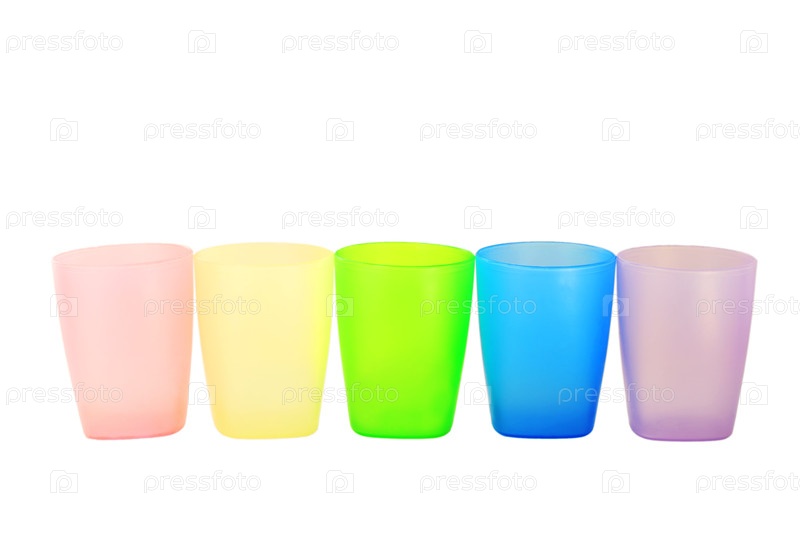 Пять красочных пластиковых чашек, аккуратно расположенных в ряд