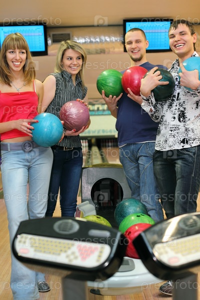 Парни и девушки стоят возле тенпинга, играя в боулинг с шарами для игры