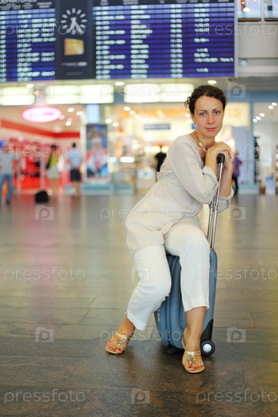 Красивая молодая женщина, сидящая на багаже в холле аэропорта и