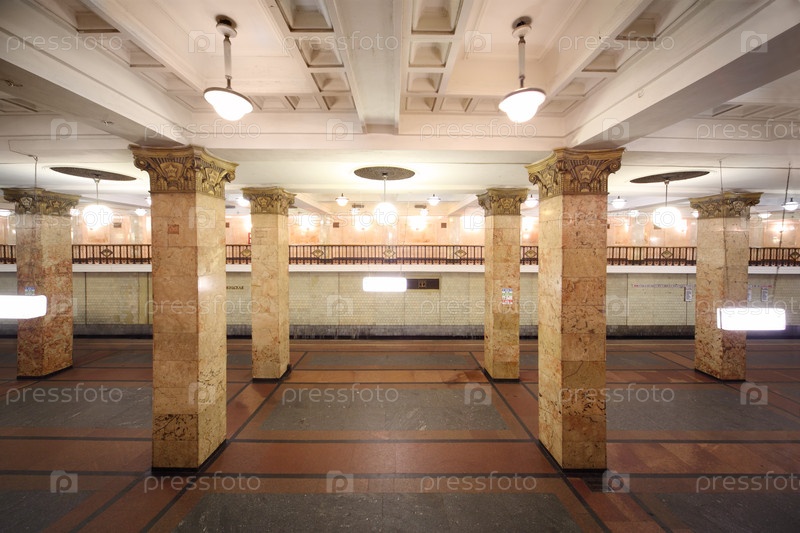 Пустая станция метро, мраморные белые колонны, гранитный пол, яркие огни
