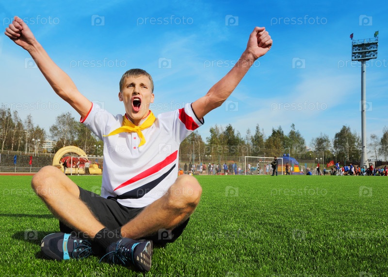 Молодой человек в белой рубашке сидит на футбольном поле и кричит