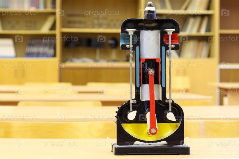 Модель двигателя внутреннего сгорания на столе в пустой школе физики