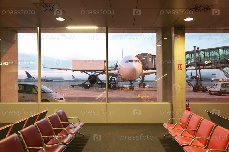 Пустой зал ожидания с красными креслами в аэропорту, окна, самолеты