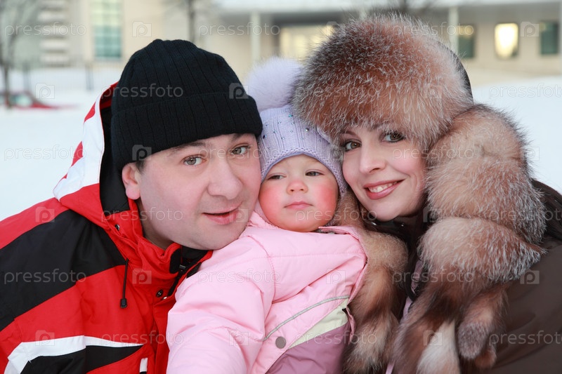 Мать и отец держали свою маленькую дочь, зимой, в многомагазине