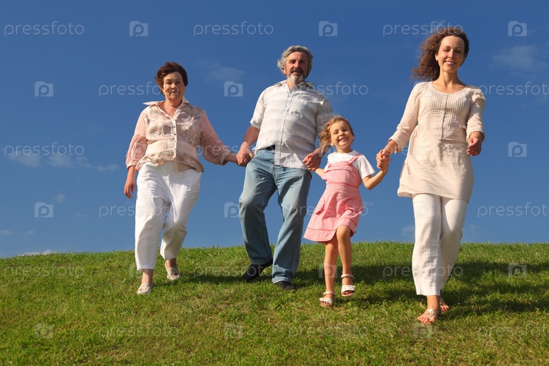 С маленькой девочкой, матерью и бабушкой и дедушками, держащимися за руки и семьей