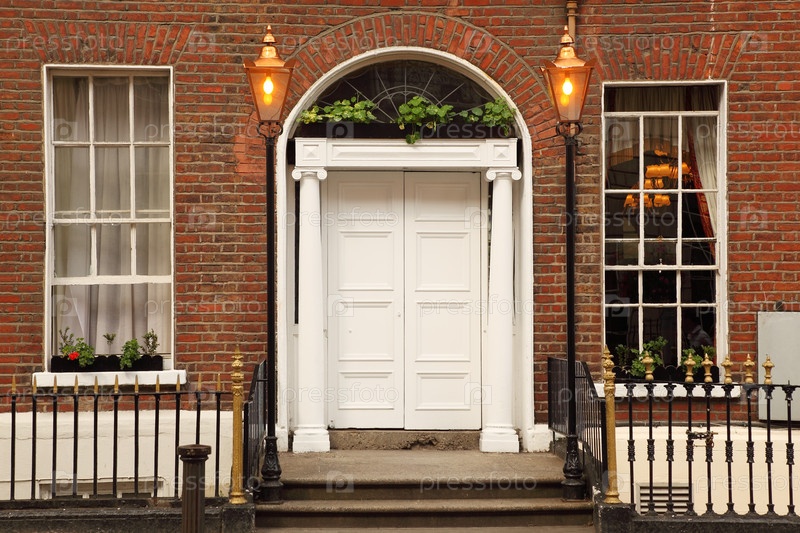 Первый этаж и вход в красивое здание, белые двери, два