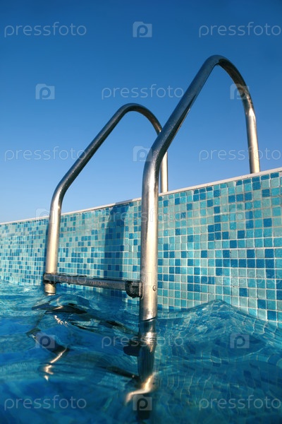 Металлическая бассейнная лестница стоит в чистой голубой воде