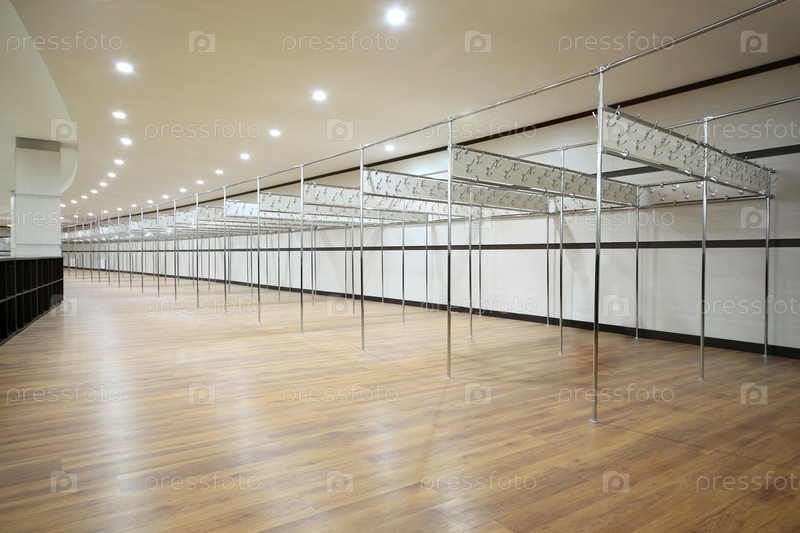 Пустое торговое пространство с металлическими стойками и деревянным полом