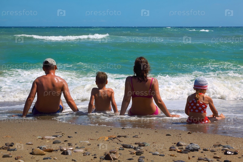 Отец, мать, маленький сын и дочь сидят на пляже и смотрят в воду
