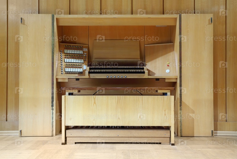 Детальность деревянной панели управления массивного трубного органа; многие клавиши и переключатели