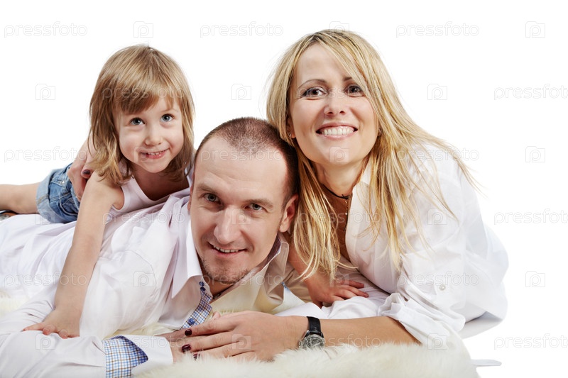 Отец и мать лежат на волосатом белом ковре, маленькая дочь лежит