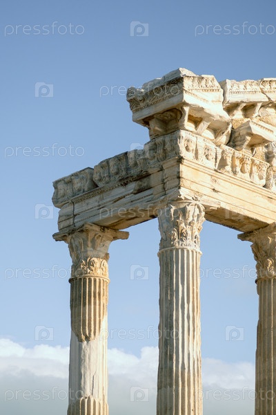 Руины белого мраморного Храма Аполлона на фоне неба в лучах закатного солнца в Сиде, Турция