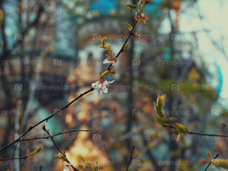 Цветущая ветка на фоне Храма Спаса на Крови в Санкт-Петербурге