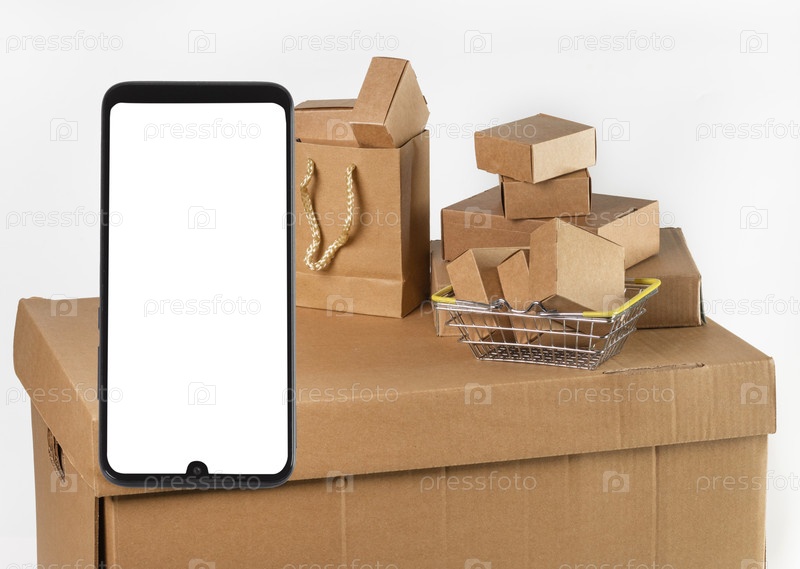 Картонные коробки различных размеров и смартфон с изолированным экраном на белом фоне. доставка с рынков, онлайн-магазинов