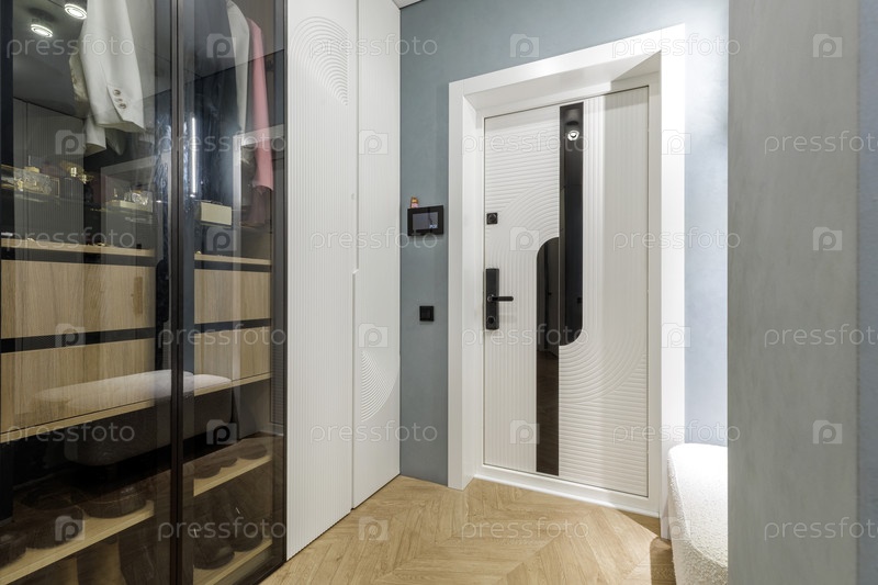 Яркий современный вход с роскошным стеклянным гардеробом со внутренним освещением. включает белую дизайнерскую дверь со смарт-замком, дубовый паркет из рысиной кости и минималистическую белую скамейку. профессиональная архитектурная фотография
