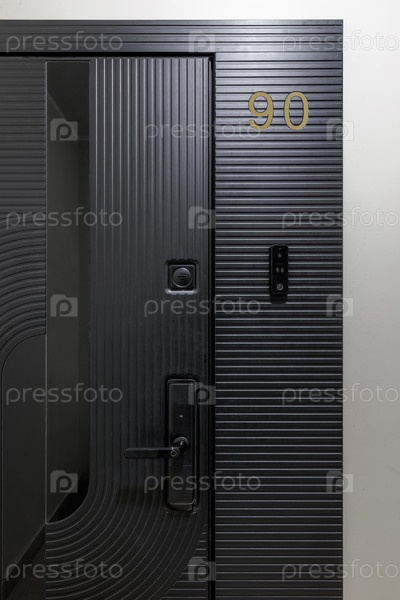 Ближайшее изображение современной черной входной двери квартиры с ребристой текстурой и геометрическими узорами. включает интеллектуальную электронную ручку со сканером отпечатков пальцев, цифровым видеоинтерфоном и золотым номером 90