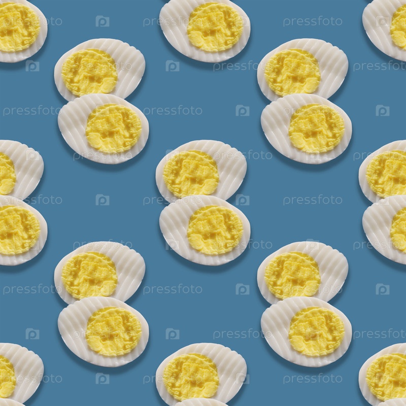Бесшовный рисунок из двух половин свежих варенных яиц с текстурированными вырезами на синем фоне