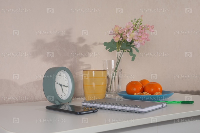 Уютное утреннее рабочее место с будильником, блокнотом, кофе и свежими фруктами