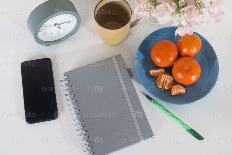 Спокойная натюрмортовая композиция на белом столе с зеленоватым будильником, спиральным ноутбуком со смартфоном, желтой полосатой кружкой и тарелкой спелых мандаринов рядом с вазой с розовыми цветами. Идеально подходит для темы производительности, управле