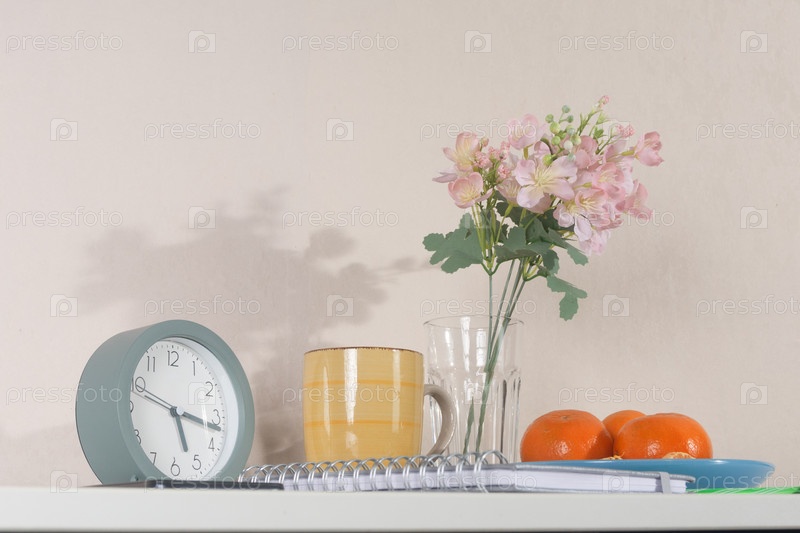 Уютное место для утренней работы с будильником, блокнотом, кофе и свежими фруктами. низкий угол