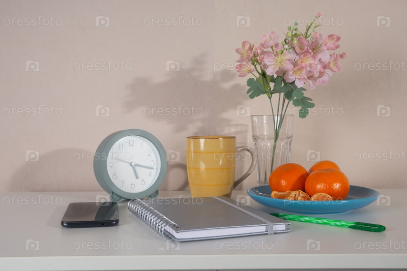 Спокойная натюрмортовая композиция на белом столе с зеленоватым будильником, спиральным ноутбуком со смартфоном, желтой полосатой кружкой и тарелкой спелых мандаринов рядом с вазой с розовыми цветами. Идеально подходит для темы производительности, управле