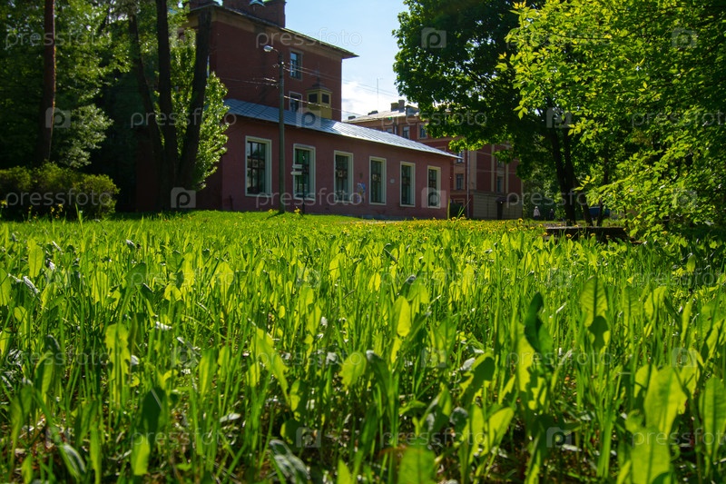 Красное кирпичное историческое здание с металлической крышей в окружении деревьев в солнечный летний день с лужайкой из сочной зеленой травы на переднем плане