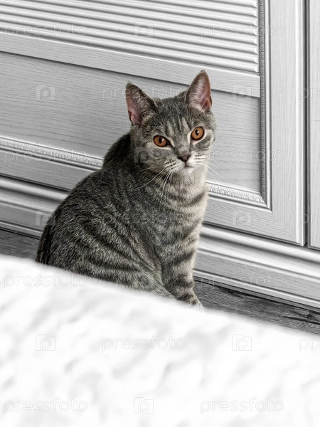 Милый кот, сидящий возле панели с любопытным выражением