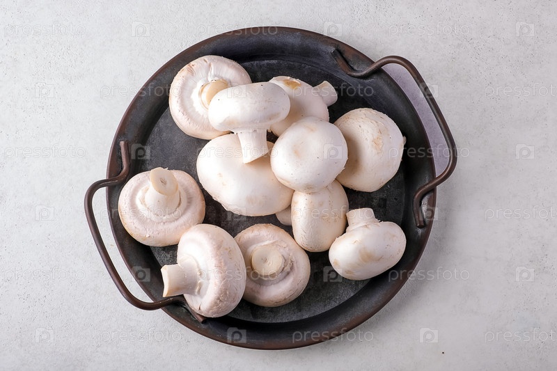 Свежие шампиньоны, расположенные в деревенской железной кастрюле