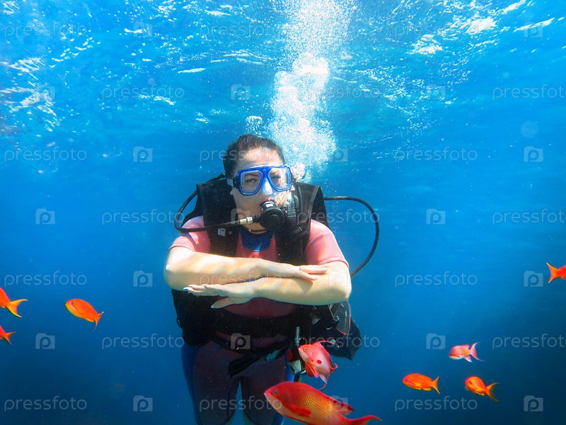 Женщина погружается в воду, исследуя яркую морскую жизнь под водой