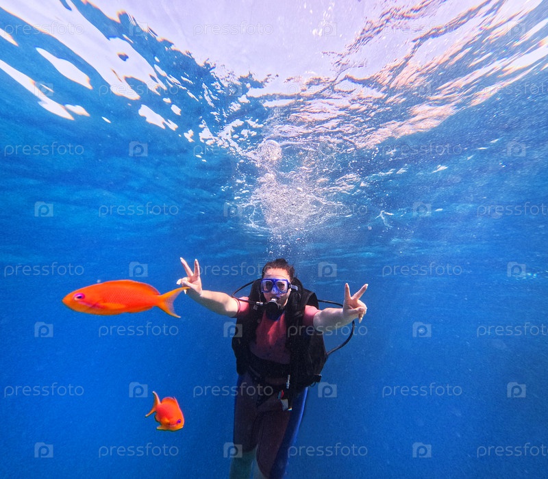 Скуба-дайвинг с тропическими рыбами Женщина чувствует свободу под водой