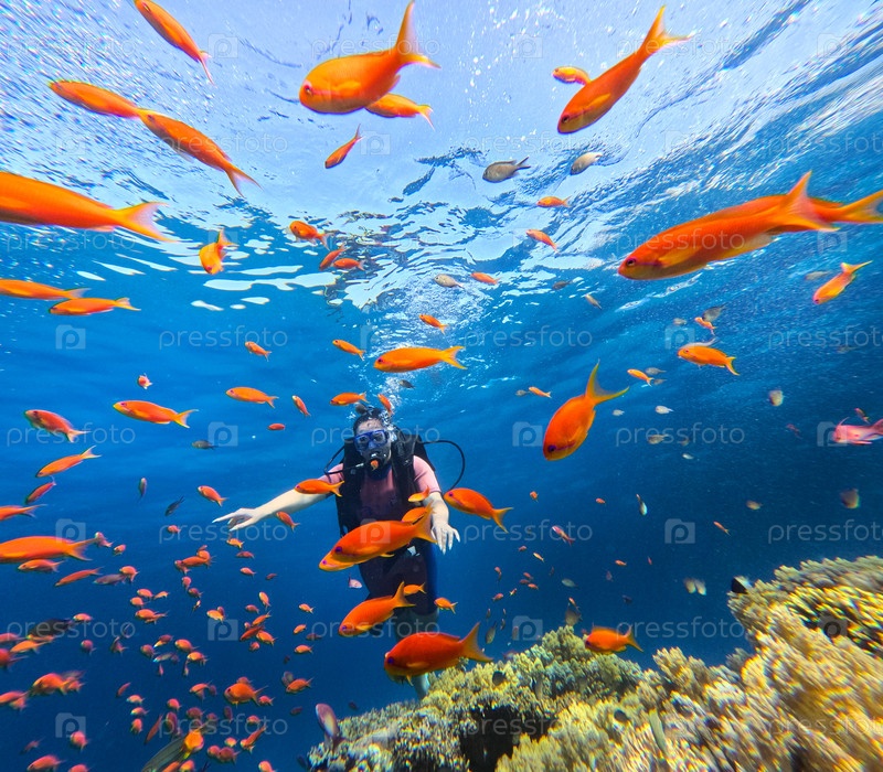 Дайвер плавает среди оранжевых рыб и кораллов в чистой голубой воде океана