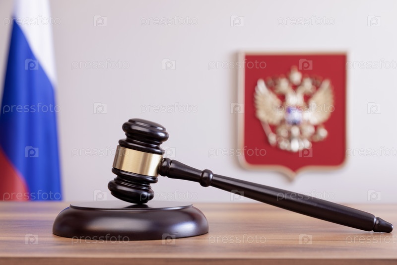 Судебный молоток на фоне флага и герба России
