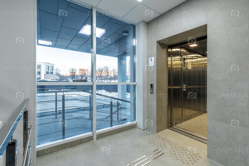 Яркое минималистическое лифтовое лобби. включает в себя лифт из нержавеющей стали, большие панорамные окна и металлические тактильные предупреждающие индикаторы на полу для слабовидящих людей. доступный современный дизайн интерьера