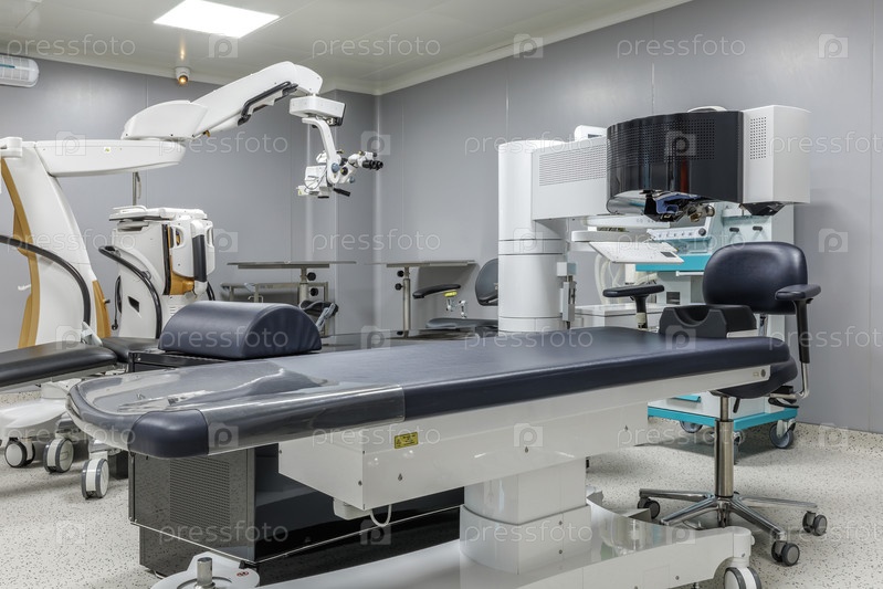 Интерьер высокотехнологичного кабинета офтальмохирургии. Обладает регулируемой хирургической кроватью, эксимерной лазерной системой и профессиональным операционным микроскопом. Чистая стерильная медицинская среда для передовых процедур коррекции зрения