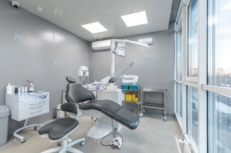 Яркий минималистский стоматологический кабинет с профессиональным черным стулом для лечения, медицинским оборудованием и большими панорамными окнами. Чистый серый интерьер со современным освещением для услуг здравоохранения