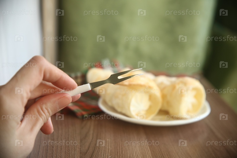 Вкусные пирожные трубочки с белковым кремом и десертная вилка в женской руке. Крупный план