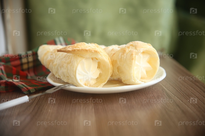 Вкусные пирожные трубочки с белковым кремом на тарелке. Крупный план