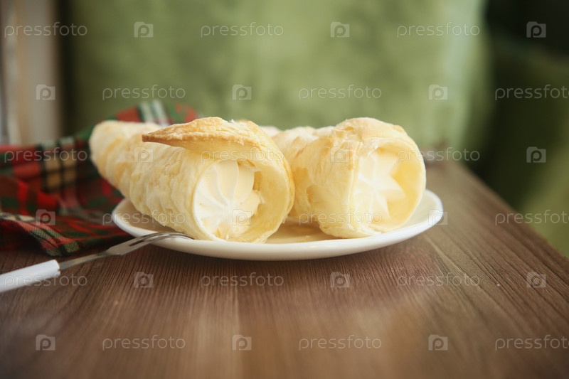 Две вкусные пирожные трубочки с белковым кремом на тарелке. Крупный план