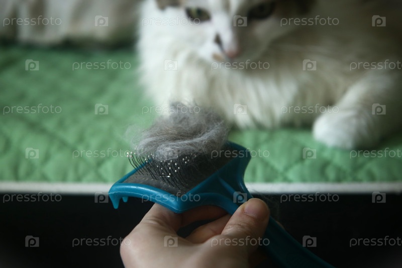 Рука с расческой для животных с шерстью на ней и кот на диване. Крупный план