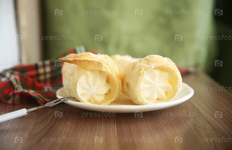 Вкусные пирожные трубочки с белковым кремом на тарелке. Крупный план