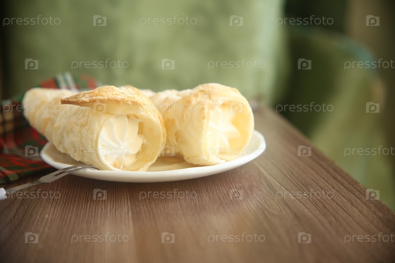 Вкусные пирожные трубочки с белковым кремом на тарелке. Крупный план