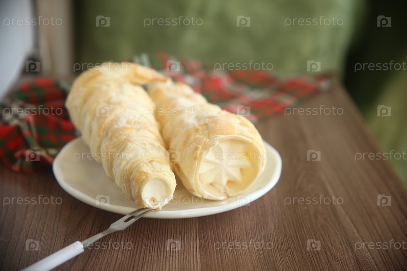 Вкусные пирожные трубочки с белковым кремом с вилкой на тарелке. Крупный план