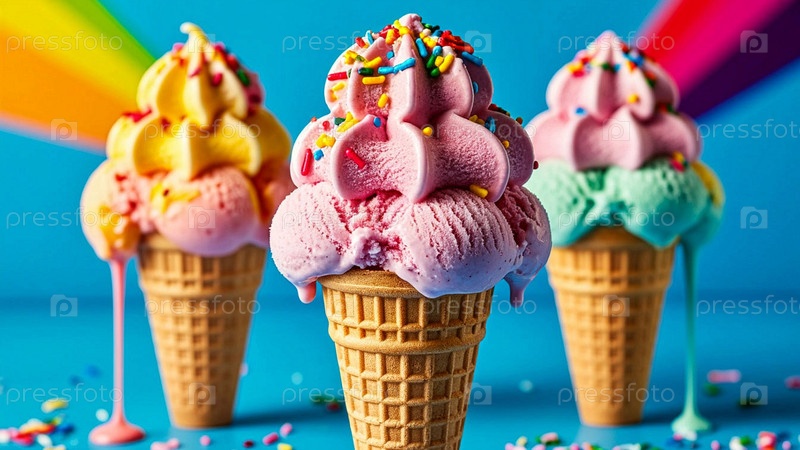 Мороженое в вафельном рожке с разными вкусами. Вкусное мороженное на ярком разноцветном фоне. Мороженное крупный план. Сладкий, холодный десерт. Кремовое ванильное мороженое с разными вкусами в вафельных конусах