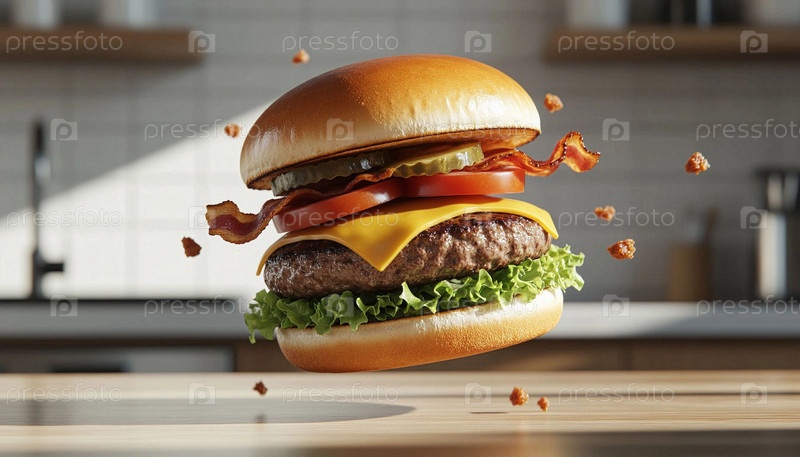 Гамбургер крупный план. Бургер. Гамбургер. Чизбургер. Фастфуд. Большой вкусный домашний летающий гамбургер