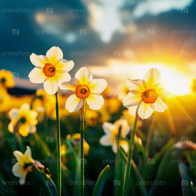 Цветы нарцисса растут в клумбе, когда заходит солнце. Свет сияет через их лепестки, создавая яркую сцену в саду на закате. Природа показывает свои цвета вечером Генеративный ИИ